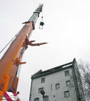 65 Meter musste der Kranausleger ausgefahren werden, um das restaurierte Nest auf den Schlossgiebel des Bischofschlosses zu hieven